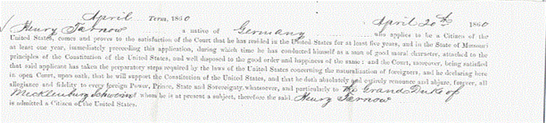 Henry Frederick William Tarnow is my first Tarno ancestor to come to America. He was born 27 November 1818 in Mecklenburg-Schwerin, Germany. Henry is the son of Joachim Jacob Daniel TARNOW born 14 SEP 1782 in Mecklenburg, Mecklenburg-Schwerin, Germany and Agneta Dorothea Elisabeth CRULL born 28 OCT 1788 in Mecklenburg, Mecklenburg-Schwerin, Germany. As far as I know Henry only had one sibling, Agnes Dorothea Sophia TARNOW born 25 DEC 1815 in Rostock, Germany. Henry Tarnow and Nancy Sheffield were married 26 August 1855 in Jefferson County, MO. Their children are: Mary Margaret Tarno, b. 05 May 1857 John William Tarno, b. 29 March 1858 Charles Henry Tarno, b. 30 May 1859 in Missouri Albert Lorenzo Tarno, b. 05 September 1860; d. 28 August 1861. Amandus M. Tarno, b. 20 January 1862 Andrew Jackson Tarno, b. 30 January 1863; d. 13 October 1866. James Augustus Tarno, b. 14 January 1865; d. 16 March 1878. Henry Edward Tarno, b. 09 August 1866 Nancy Meleta Tarno, b. 05 January 1869 Agness Tarno, b. 09 January 1871; d. Abt. 1873 Henry applied for American citizenship on 31 March 1849 in St. Louis, MO. and became a citizen 20 April 1860 in St. Louis, Missouri.